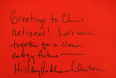 希拉里題詞全文:“向中國的網(wǎng)民問好!讓我們?yōu)榍鍧嵞茉吹奈磥砉餐Α@?羅德姆?克林頓?!?/font>