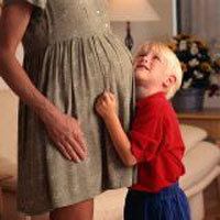 The pink and blue badges reading: "There is a baby in my belly" are