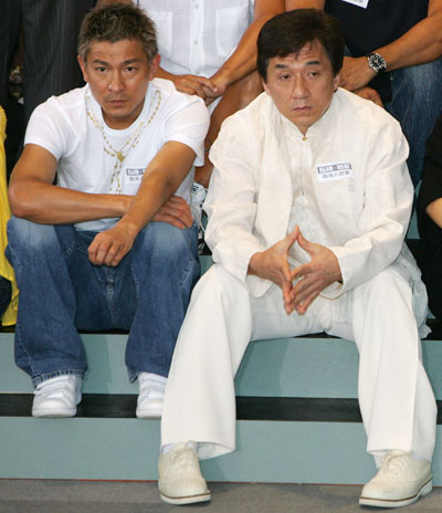 Hong Kong singer Andy Lau (L) and actor Jackie Chan attend a news conference