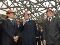 Walking into the construction site of the National Stadium, Rogge shook hands