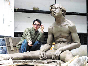 王小波裸體雕塑作者——廣州美術(shù)學(xué)院學(xué)生鄭敏工作時(shí)的留影。 |