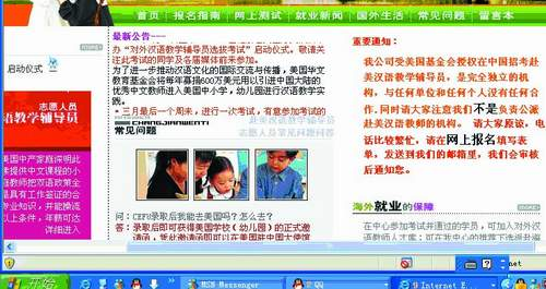 記者在該公司網(wǎng)站上看到,一方面公司宣稱:美國(guó)華文教育基金會(huì)將每年募捐600萬(wàn)美元用以引進(jìn)中國(guó)內(nèi)地的優(yōu)秀中文教師進(jìn)入美國(guó)中小學(xué)、幼兒園進(jìn)行漢語(yǔ)教學(xué)實(shí)踐活動(dòng),另一方面又發(fā)緊急通知,稱公司受“美國(guó)基金會(huì)”授權(quán)在中國(guó)招考赴美漢語(yǔ)教學(xué)輔導(dǎo)員。兩個(gè)基金會(huì)是什么關(guān)系,記者不得而知。