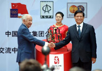 Former IOC president Juan Antonio Samaranch (left) receives gift from BOCOG President Liu Qi at the opening of the World Olympic Collectors Fair in Beijing, June 24, 2007. (Xinhua Photo) |