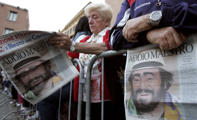 A woman reads a special edition of a newspaper, which reported the death of Luciano Pavarotti, in downtown Modena September 6, 2007.(Reuters)