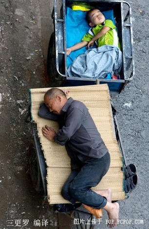 23,中國北京街頭一景。一大人和一小孩在街上的三輪車上睡覺。(Ng Han Guan - AP 8月7日)