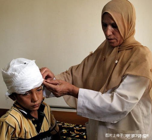 7,巴格達(dá)一個(gè)公園里的炸彈爆炸造成12人死亡、17人受傷,一名受傷的小孩在接受護(hù)士的包扎。(Adil Al-Khazali - AP 8月1日)