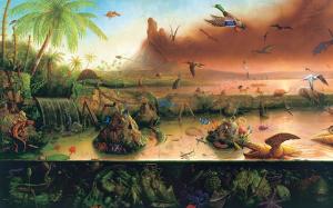 He spends a great deal of time researching the science behind his paintings so that every detail is correct. But many works also include imaginary creatures in environments that seem to come from a science fiction movie.