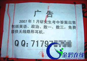 記者在貴陽(yáng)醫(yī)學(xué)院、貴大蔡家關(guān)分院等學(xué)??匆?jiàn),免費(fèi)提供作弊耳機(jī)的廣告分別貼在校園宣傳櫥窗內(nèi)和電桿上,廣告內(nèi)容是出售2007年1月研究生考試答案,包括英語(yǔ)、政治、數(shù)學(xué)等學(xué)科,通過(guò)免費(fèi)提供的無(wú)線(xiàn)隱形耳機(jī)作弊,廣告上還留下出售者的QQ號(hào)碼作為聯(lián)系方式。