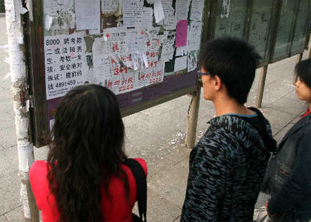 宣傳欄前圍了不少看廣告的同學(xué),關(guān)于這則廣告,記者向大家了解了一下。國際經(jīng)濟(jì)與貿(mào)易系的小戰(zhàn)說,聘請槍手的事學(xué)校以前就有過,什么英語四六級考試、計(jì)算機(jī)等級考試......已經(jīng)司空見慣了,“可在校園這么明目張膽聘考研槍手,還是第一次見?!毙?zhàn)還說,“這樣就算考上又有什么用,也是在浪費(fèi)時(shí)間,何必呢?”
