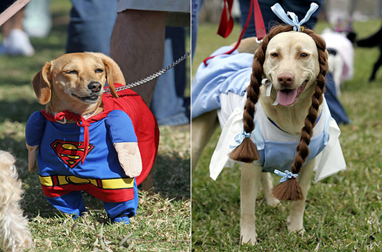圖片十二:在美國(guó)加州長(zhǎng)灘舉行的萬(wàn)圣節(jié)服裝游行上,一種短腿長(zhǎng)身的德國(guó)種獵犬芭比裝扮成超人的模樣;右圖中這個(gè)小狗的造型你熟悉么?它是來(lái)自新奧爾良的洛克西,它扮演的就是《綠野仙蹤》中的小女孩多羅茜。