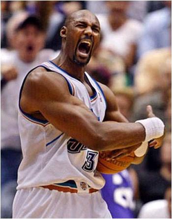 雖然,他缺少那枚象征性的總冠軍戒指,但他的“肉肘”是絕對的天下第一,撞飛巴克利,打殘羅賓遜,馬龍,強(qiáng)悍堅(jiān)毅的當(dāng)仁不讓著。他如果金剛的體魄,讓他在他NBA生涯中如郵差般風(fēng)雨無阻的工作。NBA,歷史最偉大的球員之一,也是喬丹時(shí)代最大的犧牲品。馬龍的一生崎嶇坎坷,雖然贏得球賽無數(shù),在他3歲的時(shí)候父親就自殺了,母親拖扯大了9個(gè)孩子,馬龍說,母親是他最大的偶像??嚯y的童年,成就了他堅(jiān)強(qiáng)而偉大的人生,馬龍也許是不在乎的,就如他在自傳中所說:At the end of my life, I don't want to be remembered as the kind of person who just sat on his rear end and said, “ I've made it.” I don't ever want to have to say that I didn't give it everything that I've got. Sure there are days that I don't feel like working hard...but I do it anyway, cause that's who I am.(在我離開人世的那一天,我不愿意在人們記憶中是這樣一種人,這種人只是一屁股坐在那里對人說:“我功成名就了”,也永遠(yuǎn)不想說對我所取得的一切沒有盡到自己最大的努力。當(dāng)然,我也有過放松懈怠的日子...但無論如何我還是努力去干,因?yàn)槟钱吘故钦鎸?shí)的我。)