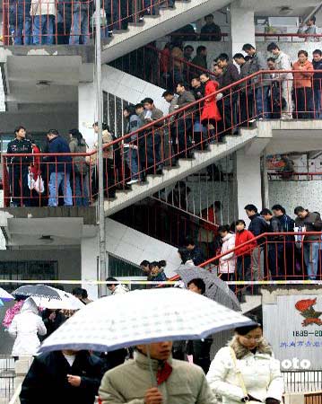 昨天(9日,下同),2008年國(guó)家公務(wù)員考試在全國(guó)38個(gè)城市同時(shí)開(kāi)考。根據(jù)最新統(tǒng)計(jì),今年64萬(wàn)的考生總數(shù)創(chuàng)下歷史新高,比去年增加12%。他們將競(jìng)爭(zhēng)近1.4萬(wàn)個(gè)職位,錄取比例約達(dá)46比1。其中,北京地區(qū)的考生總數(shù)為8萬(wàn)人。人事部負(fù)責(zé)人稱(chēng),盡管報(bào)考人數(shù)逐年遞增,但并不會(huì)因此提高考題難度。