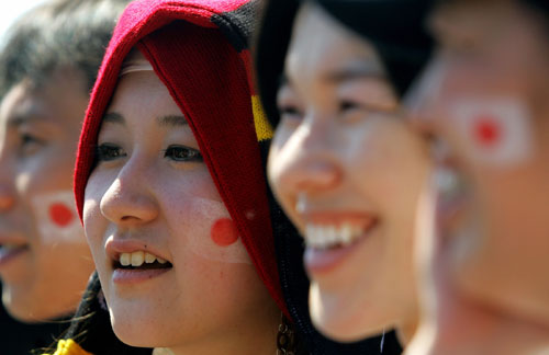 Japan soccer fans react watching the World Cup soccer match between Australia and Japan in a so-called 'fan festival' in Frankfurt, June 12, 2006.(Reuters)