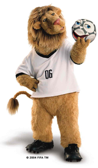 2006 Germany Goleo VI and Pille. A lion wearing a Germany jersey with the number 06, and a speaking football.