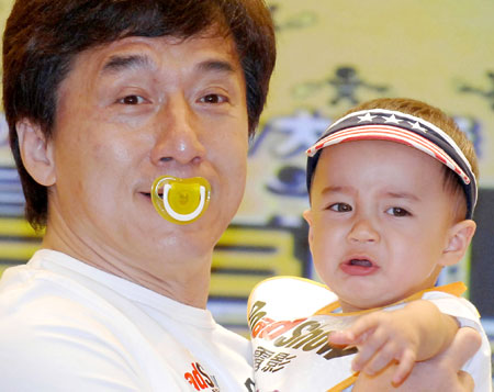 Hong Kong movie star Jackie Chan carries young actor Matthew during a news conference to promote his new movie 'Rob-B-hood' in Hong Kong August 1, 2006. (Reuters)