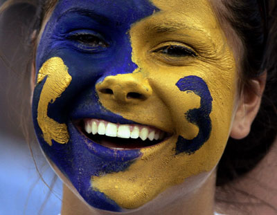 Fan Nicole Paviglionite has her face painted with the colors of the Los Angeles Galaxy and the number of player David Beckham of England during the Galaxy's MLS soccer match against the New England Revolution in Foxboro, Massachusetts, August 12, 2007.[Reuters]