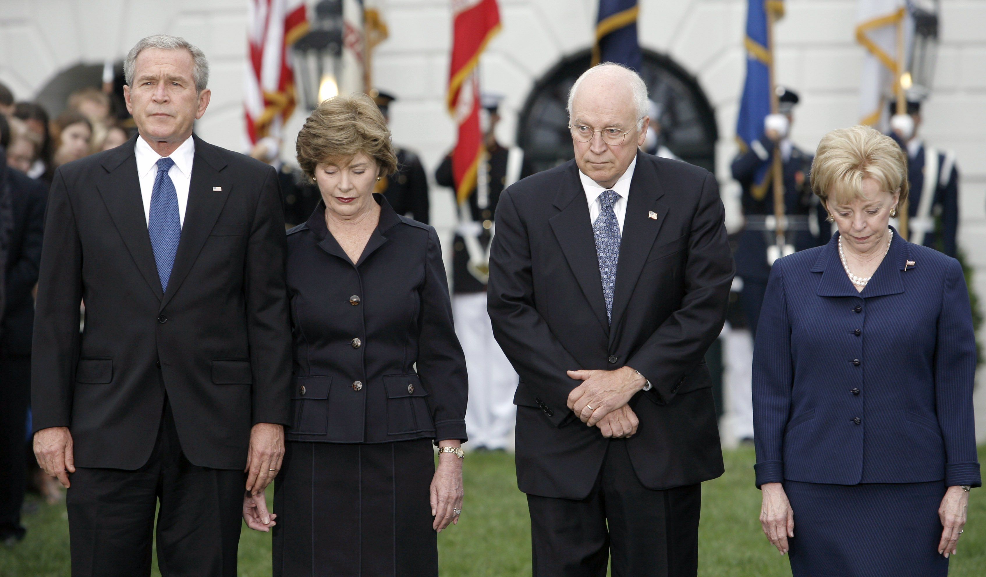 | (L-R) U.S President George W. Bush, first lady Laura Bush, Vice President Dick Cheney and his wife Lynne Cheney observe a moment of silence at the White House on the sixth anniversary of the Sept. 11 attacks in Washington September 11, 2007. (Reuters) |