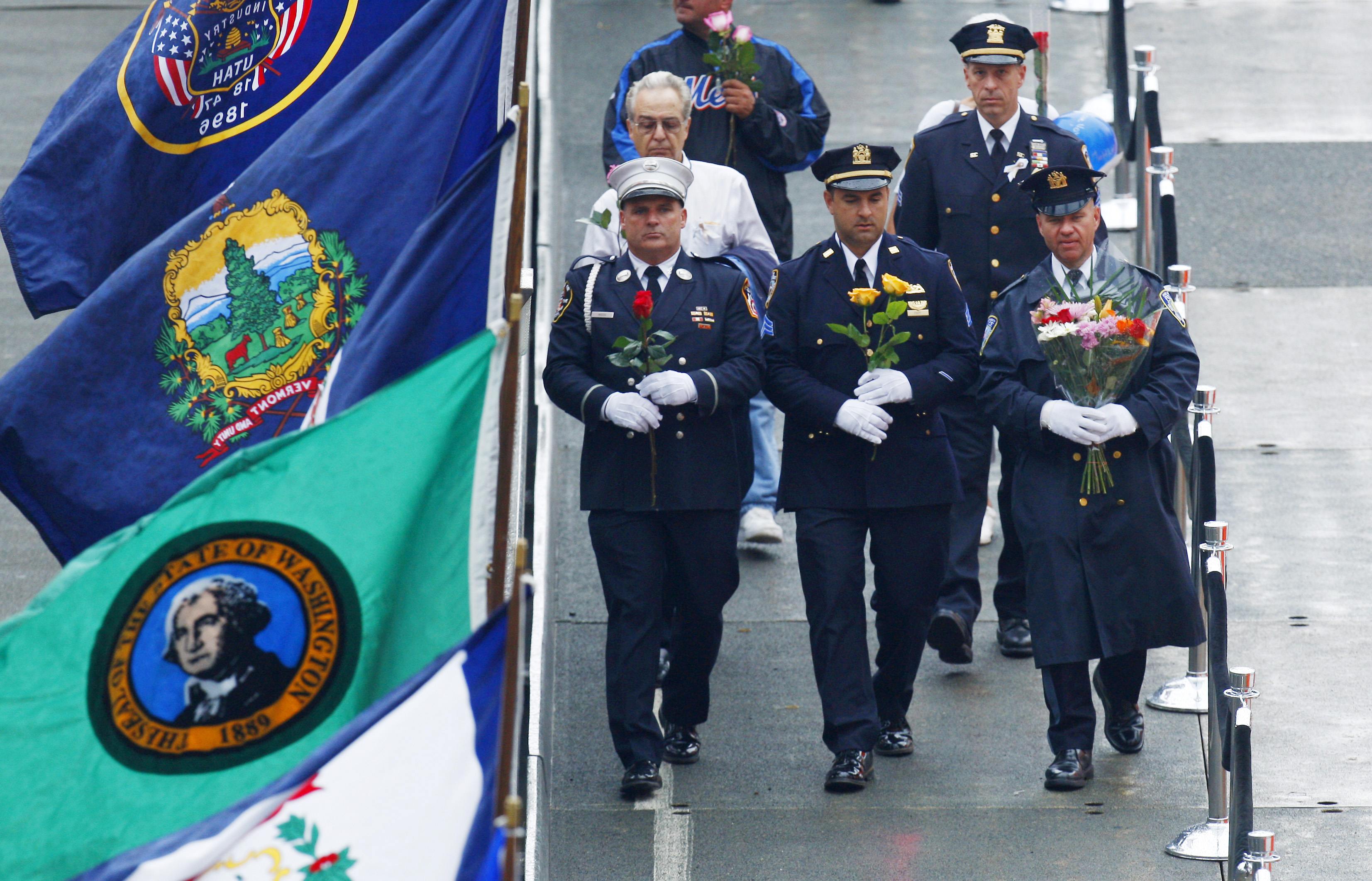 | Members of uniformed services carry flowers down to the base of the World Trade Center site on the sixth anniversary of the September 11, 2001 attacks in New York, September 11, 2007. (Reuters) |