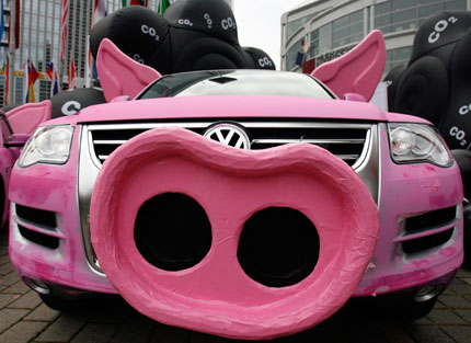 Greenpeace activists paint a Passat of German car manufacturer Volkswagen pink and drape a swine snout and ears during a protest against air pollution in front of the international car show IAA in Frankfurt September 13, 2007. (Agencies)