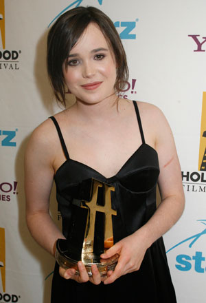 Actress Ellen Page holds her Breakthrough Acting award at the Hollywood Awards gala held by the Hollywood Film Festival in Beverly Hills, California October 22, 2007. (Agencies)