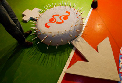 A man stands next to an artwork at a conceptual art exhibition about HIV/AIDS in Tehran December 2, 2007. (Agencies)