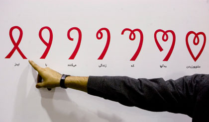 An Iranian man explains an artwork about "Love-making to those living with HIV/AIDS" during a conceptual art exhibition on HIV/AIDS in Tehran December 2, 2007. (Agencies)