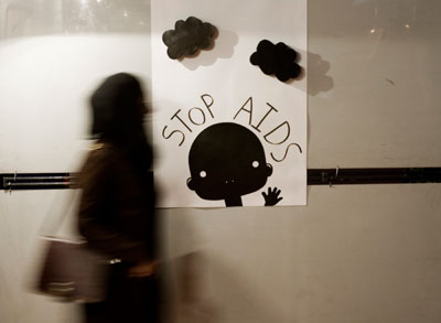 A woman walks past a poster at a conceptual art exhibition about HIV/AIDS in Tehran December 2, 2007. (Agencies)