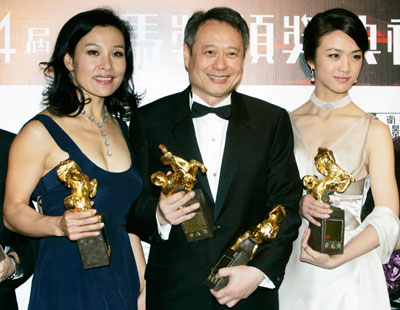 Actress Joan Chen, director Ang Lee and actress Tang Wei pose backstage at the 44th Golden Horse Awards in Taipei December 8, 2007. Chen won Best Leading Actress for "The Home Song Stories". Lee's "Lust, Caution" won him Best Feature Film, Best Director, The Outstanding Taiwanese Filmmaker of the Year and Tang the Best New Performer awards. (Agencies)