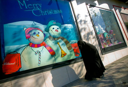 A woman walks past a window of the Hiland shopping centre, decorated for Christmas, in Tehran December 24, 2007. (Agencies)
