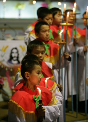 Altar boys attend Christmas Mass at the Catholic church in Gaojiabao village near the city of Taiyuan, Shanxi province, December 24, 2007. (Agencies)