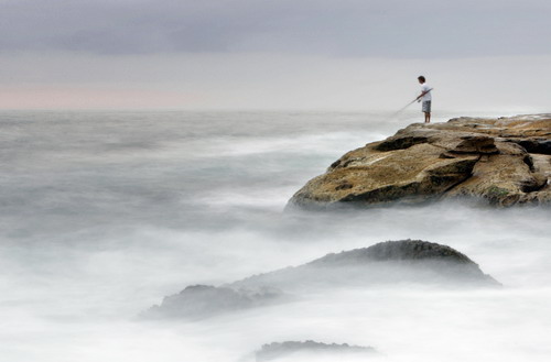 A lone fisherman stands atop a rock outcrop below Sydney's North head at dawn February 6, 2007. A U.N. climate report last week said global warming could see sea levels rise by 28 and 43 centimetres (11 and 17 inches) this century.