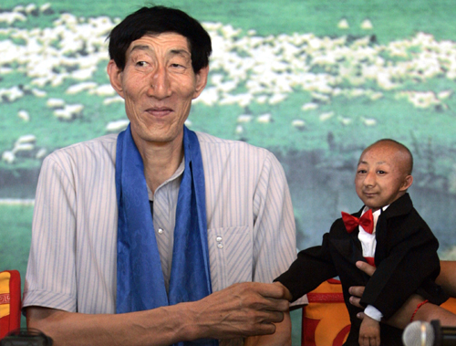 Bao Xishun (L), 56, a 2.36-metre (7 feet, 9 inches) tall herdsman listed by the Guinness World Records as the tallest living man, shakes hands with He Pingping, 19, a 0.73-metre (2 feet, 5 inches) tall man, in Baotou, north China's Inner Mongolia Autonomous Region July 13, 2007. He is applying for the Guinness World Record as the world's shortest man, local media reported.