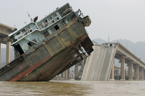 A general view shows the collapsed section of Jiujiang Bridge after it was hit by a sand-laden boat in South China's Guangdong Province June 15, 2007. The mile-long road bridge packed with cars and trucks collapsed early on Friday after being hit by a boat laden with sand, leaving part of the highway leading directly into the sea.