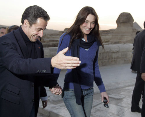 Sarkozy and Bruni walk together during a visit to the Giza pyramids in Cairo
