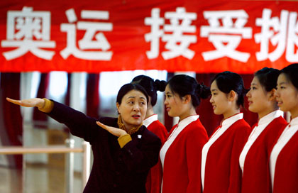 Liu Yan Zhi (L), an etiquette instructor, talks to students during an etiquette training class at a vocational school in Beijing January 7, 2008. A small group of vocational students, mostly between the ages of 16 and 18, are going through physical conditioning as well as professional training for dressing and etiquette in order to be stewards for the service industry, but a select few will become stewards for medal ceremonies during the 2008 Beijing Olympics. The banner reads,"Welcoming the challenge of the Olympics". (Agencies)