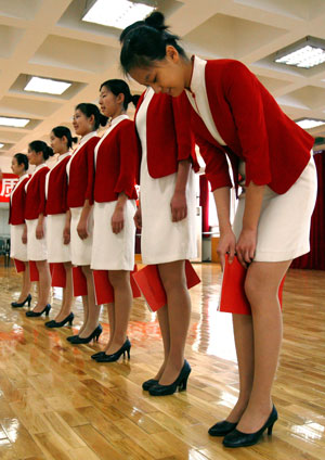 Students put books between their legs during an etiquette training class at a vocational school in Beijing January 7, 2008. A small group of vocational students, mostly between the ages of 16 and 18, are going through physical conditioning as well as professional training for dressing and etiquette in order to be stewards for the service industry, but a select few will become stewards for medal ceremonies during the 2008 Beijing Olympics. (Agencies)
