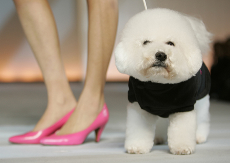 A toy poodle walks down the runway with a model during a dog fashion show at the New Year Dog Party held in Tokyo January 12, 2008. (Agencies)