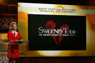 Entertainment journalist Mary Hart announces "Sweeney Todd: The Demon Barber of Fleet Street" as winner of the Golden Globe Award for best comedy or musical motion pictures at the 65th annual Golden Globe Awards news conference at the Beverly Hilton hotel in Beverly Hills, California January 13, 2008. (Agencies)