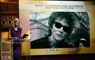 Entertainment journalist Lara Spencer announces that actress Cate Blanchett won the best supporting actress, motion picture Golden Globe Award for her role in "I'm Not There" at the 65th annual Golden Globe Awards news conference at the Beverly Hilton hotel in Beverly Hills, California January 13, 2008. (Agencies)