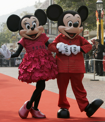People dressed as cartoon characters Mickey and Minnie greet visitors with their latest Year of the Mouse costumes at Hong Kong Disneyland January 21, 2008. Their new dressings, along with other activities, form the "Year of the Mouse Celebration" held by the entertainment theme park for the upcoming Lunar Year of the Rat. (Agencies)