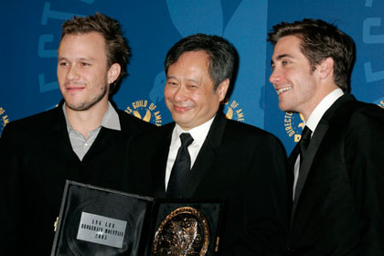 Ang Lee (C), nominated director for "Brokeback Mountain", holds his nominees plaque as he poses with the films' stars Heath Ledger (L) and Jake Gyllenhaal backstage at the 58th Annual Directors Guild Awards in Century City, California in this January 28, 2006 file photo. Ledger was found dead in his Manhattan apartment on January 22, 2008, possibly of a drug overdose, New York City police said. (Agencies)