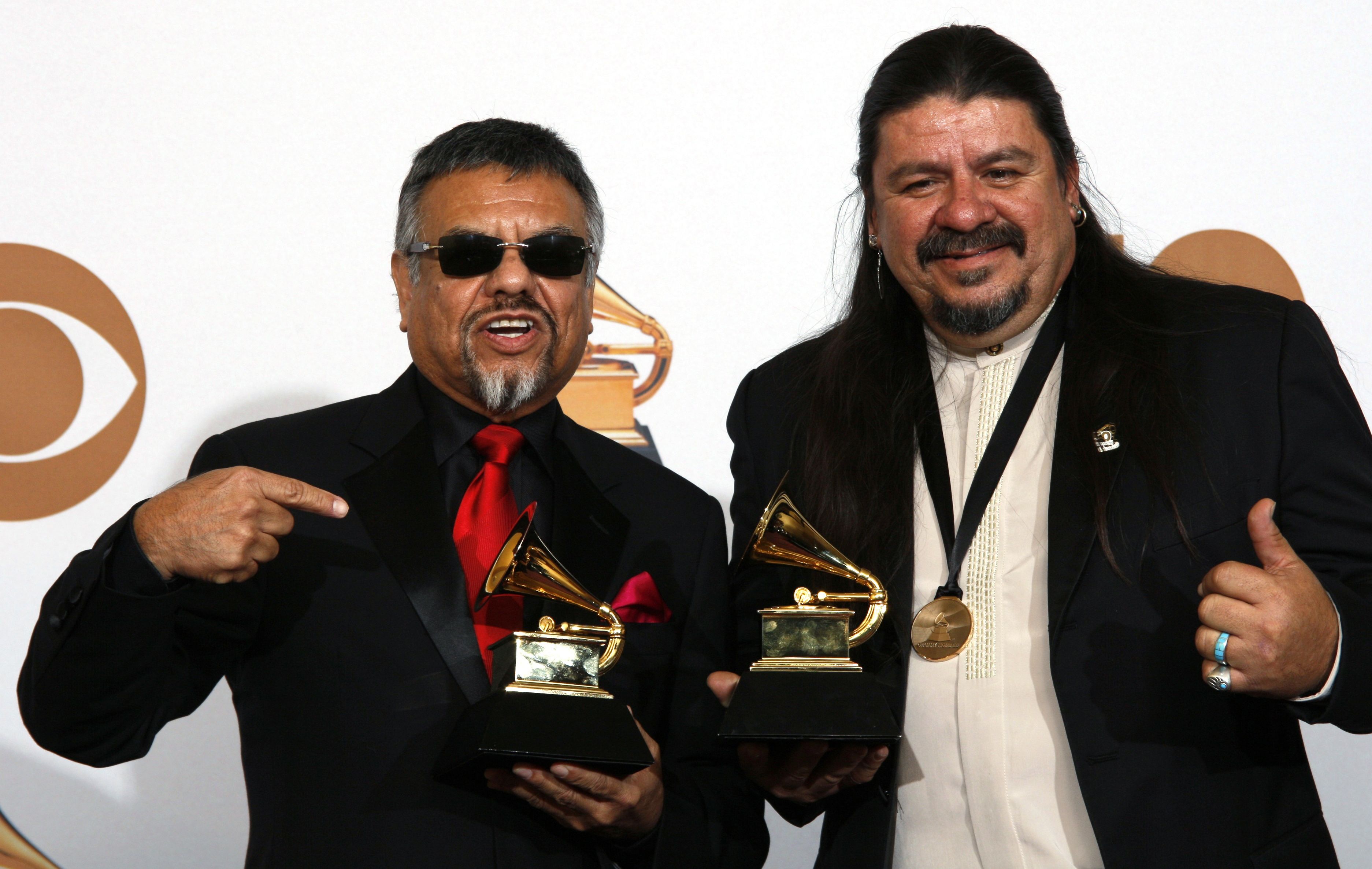 | Little Joe (L) of Little Joe y La Familia and Sam Jones pose with the Grammy award for Best Tejano Album for the recording "Before the Next Teardrop Falls" at the 50th Annual Grammy Awards in Los Angeles February 10, 2008. (Agencies) |