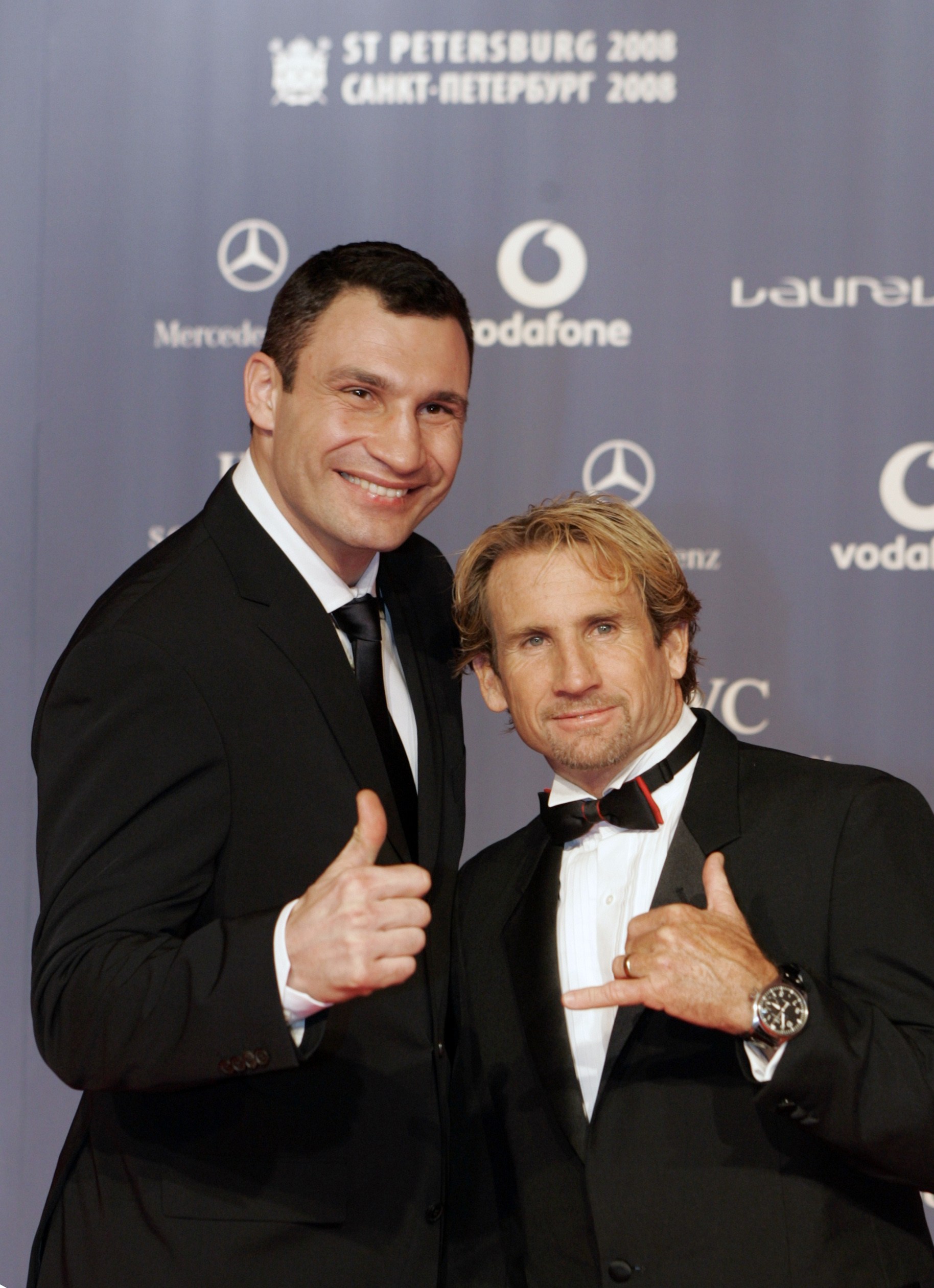 Ukrainian boxer Vitali Klitschko (L) and U.S. surfing legend Robbie Naish gesture as they arrive for the Laureus Sports Awards in the Mariinsky Theatre in St Petersburg February 18, 2008. Tennis world number one Roger Federer won the prestigious Laureus Sportsman of the year award for a record fourth year in a row on Monday. (Agencies) |