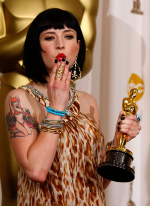 Diablo Cody holds the oscar for best orignal screenplay for "Juno" backstage at the 80th annual Academy Awards in Hollywood, February 24, 2008. (Agencies)