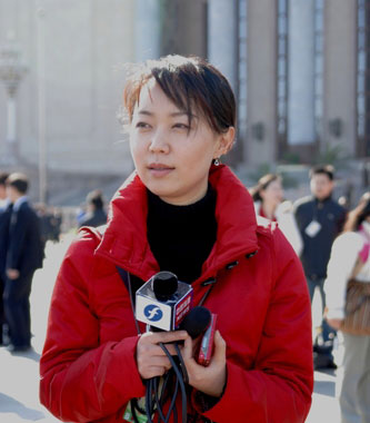 A journalist reports about the opening the First Session of the 11th National Committee of the Chinese People's Political Consultative Conference in the Tian'anmen Square March 3, 2008. (people.com.cn)