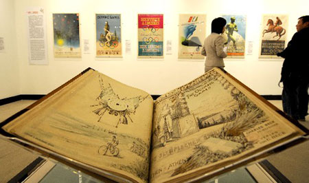 Visitors walk pass the the Olympic posters at the Olympic poster exhibition in the exhibition hall at Liaoning Provincial Museum March 12, 2008. The exhibition kicked off on Wednesday and more than 100 precious Olympic posters and some Olympic books, tickets, and events schedules are on display. (Xinhua)