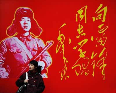 A woman passes a wall with a portrait of Lei Feng near a bookstore in Shanghai, March 3, 2012. |