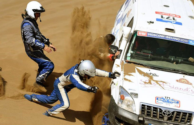 Updated: 2016-07-20Racers reach the finishing line during Stage 10 of the Silk Way Rally 2016 from Hami, Xinjiang Uygur Autonomous Region, to Dunhuang, Gansu province.