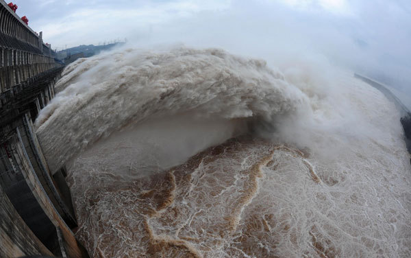 Floodwater rushes through the sluice gates of the Three Gorges Dam in Yichang, Central China's Hubei province on July 20, 2010. All ferry services were halted at the Three Gorges Dam on Monday and the 30-km exclusive road along the river was opened to vehicles carrying shipping cargo.[Photo/Xinhua]