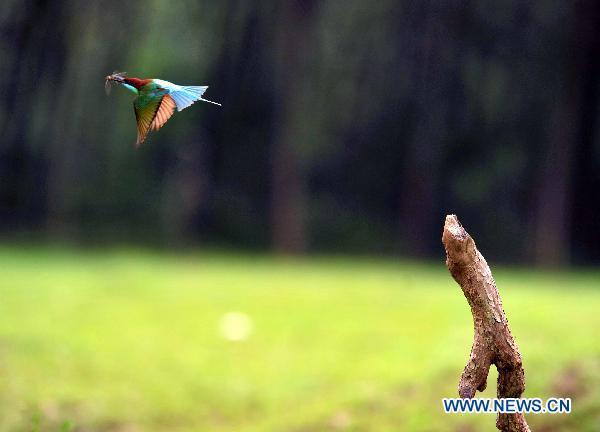 Photo taken on July 17, 2010 shows a unique blue-throated bee-eater in Hong'an County of central China's Hubei Province. (Xinhua/Jia Liancheng)